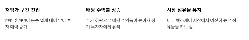 - 정책 변화: 미국 정부의 약가 인하 정책 등 헬스케어 산업에 대한 규제 강화 가능성이 있습니다.