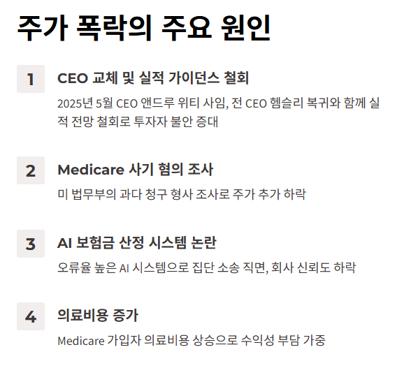 최근 UNH의 주가가 급락한 주요 원인은 다음과 같습니다:
