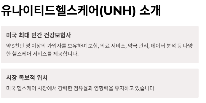UNH는 미국 최대의 민간 건강보험 회사로, 약 5천만 명 이상의 가입자를 보유하고 있습니다. 보험, 의료 서비스, 약국 관리, 데이터 분석 등 다양한 헬스케어 서비스를 제공하며, 미국 헬스케어 시장에서 독보적인 위치를 차지하고 있습니다.