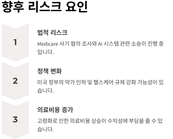 - 법적 리스크: Medicare 사기 혐의 조사와 AI 기반 보험금 산정 시스템 관련 소송이 진행 중입니다.