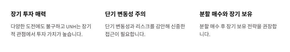 UNH는 현재 다양한 도전에 직면해 있지만, 장기적인 관점에서 보면 여전히 매력적인 투자 대상입니다. 다만, 단기적인 변동성과 리스크를 감안하여 분할 매수와 장기 보유 전략을 고려하는 것이 좋습니다.