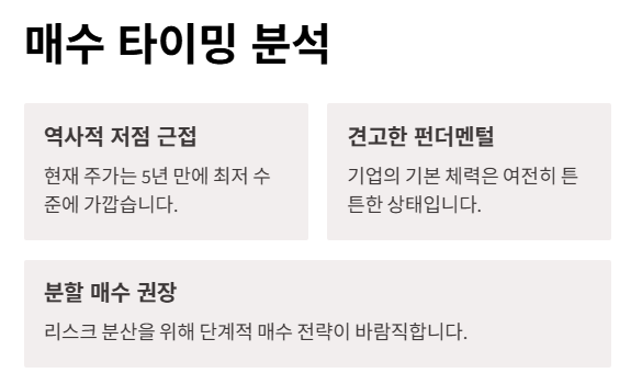 - 배당 수익률: 주가 하락으로 인해 배당 수익률이 상승하여 장기 투자자에게 매력적입니다.