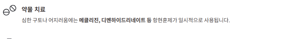 심한 구토나 어지러움에는 메클리진, 디멘하이드리네이트 등 항현훈제가 일시적으로 사용됩니다.
