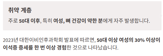 - 주로 50대 이후, 특히 여성, 뼈 건강이 약한 분에게 자주 발생합니다.