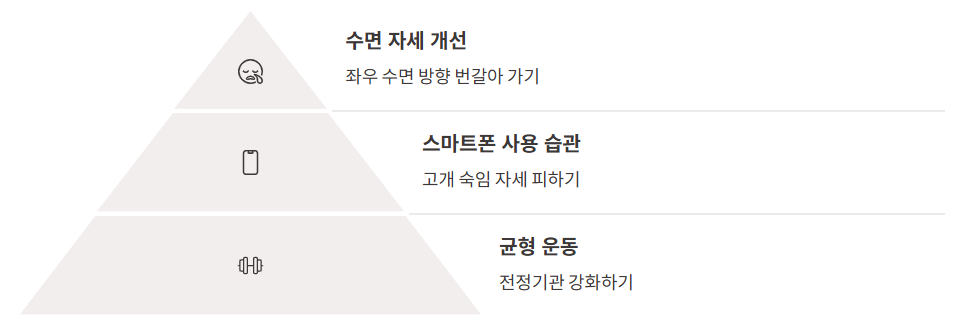 특히 수면 자세, 스마트폰 고개 숙임 등을 조심해야 합니다.