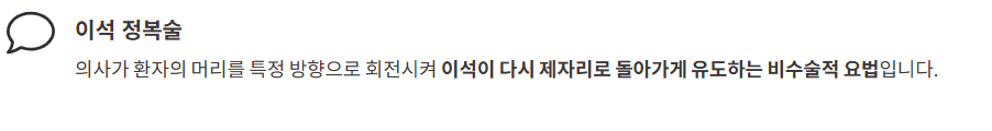 의사가 환자의 머리를 특정 방향으로 회전시켜 이석이 다시 제자리로 돌아가게 유도하는 비수술적 요법입니다.