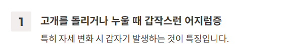 - 고개를 돌리거나 누울 때 갑작스런 어지럼증