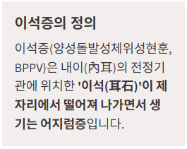 이석증(양성돌발성체위성현훈, BPPV)은 내이(內耳)의 전정기관에 위치한 ‘이석(耳石)’이 제자리에서 떨어져 나가면서 생기는 어지럼증입니다.